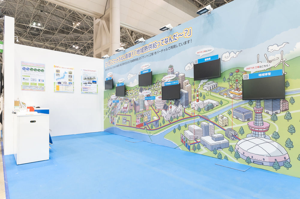 展示では、街と一体となって安定的にエネルギーを供給する地域熱供給の仕組みや設備について、Webコンテンツ「地域熱供給バーチャル工場見学」を活用した映像展示でわかりやすくお伝えしました。また、全国に広がる地域熱供給全地域や、最新事例、脱炭素化に貢献する再生可能エネルギー・未利用エネルギー活用事例など、パネルでご紹介しました。